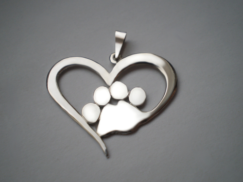 Přívěsek ve tvaru srdíčka s vloženou tlapkou uprostřed kombinující romantický symbol s hravým motivem mazlíčků.